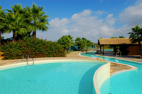 Piscina con zona relax e comodi divanetti dove assaporare all’ombra del grande carrubo rinfrescanti drink e bibite.