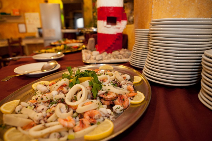 Ristorante climatizzato con splendida vista sul mare e terrazza panoramica con la possibilità, su prenotazione di mangiare all'aperto. Servizio a buffet con piatti regionali ed internazionali con ampia scelta di antipasti, primi, secondi e contorni, vera pizza italiana, frutta, dolce. Serate a tema. Sono sempre inclusi, salvo diversa indicazione, senza alcun supplemento a pranzo o a cena acqua microfiltrata, vino bianco e rosso della casa, birra chiara. Il personale è formato per preparare alimenti in caso di diverse intolleranze alimentari, ma non sono previsti prodotti specifici; è possibile limitando le contaminazioni cucinare con prodotti forniti dallo stesso ospite.