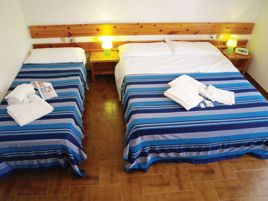 In basse palazzine immerse nel verde si trovano 62 ampie camere, totalmente rinnovate. Tutte le camere dispongono di aria condizionata autonoma, tv, cassaforte, mini-frigo, asciugacapelli, servizi e telefono. Si dividono in camere doppie, matrimoniali, triple e quadruple con letto a castello. Inoltre, possibilità di sistemazione in camere Family, da 3 a 5 posti letto, composte da due camere distinte con unico bagno.Tutte le camere dispongono di un dehors privato e attrezzato.