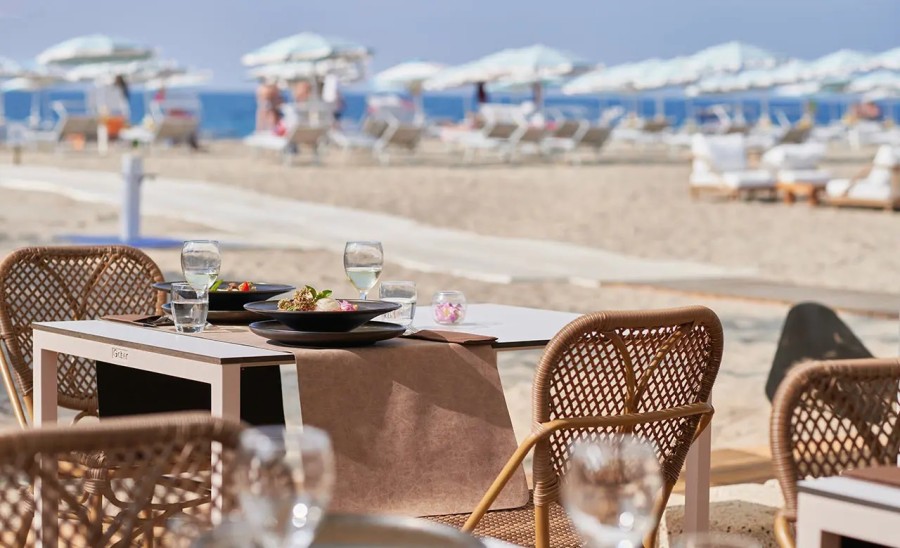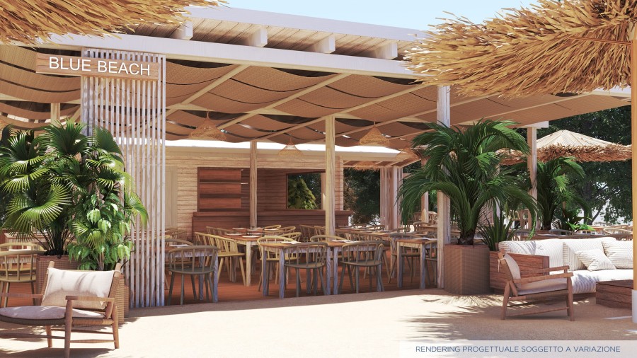 Bar spiaggia: caffetteria; aranciata, coca cola e birra alla spina in bicchiere da 20 cl; selezione di amari e vini.