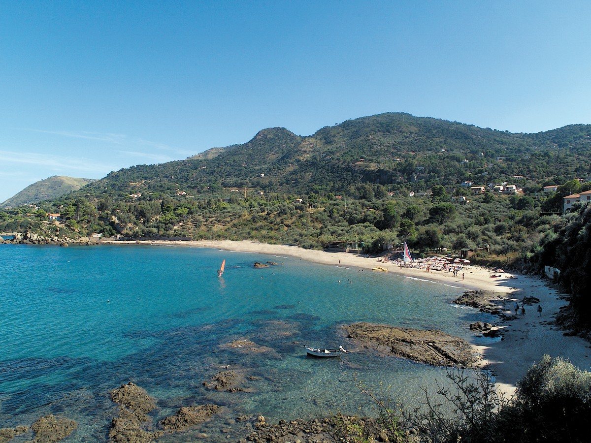 Mare cristallino, una baia unica al mondo per posizione e bellezza, di sabbia, piccoli ciottoli e scogli bassi consentono un accesso dolce al mare, piacevole anche per gli ospiti più piccoli. La spiaggia è raggiungibile a piedi attraverso un sentiero di vegetazione mediterranea o tramite servizio navetta dalle 8.00 alle 19.30. Tra i servizi: beach bar, lettini e ombrelloni riservati agli ospiti, anche nel prato antistante la spiaggia.