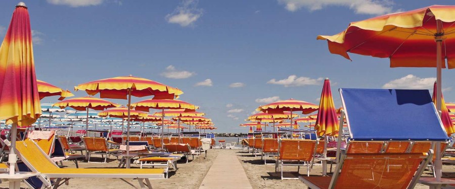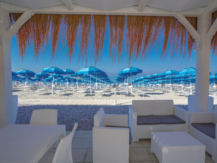 Spiaggia di ghiaia e sabbia con una forma a T (darsena) con accesso diretto dall'interno del Villaggio tramite sottopassaggio. La spiaggia è riservata, dotata di 1 ombrellone e 2 lettini a unità abitativa a partire dalla 4a fila, con servizio obbligatorio a pagamento.