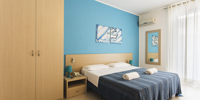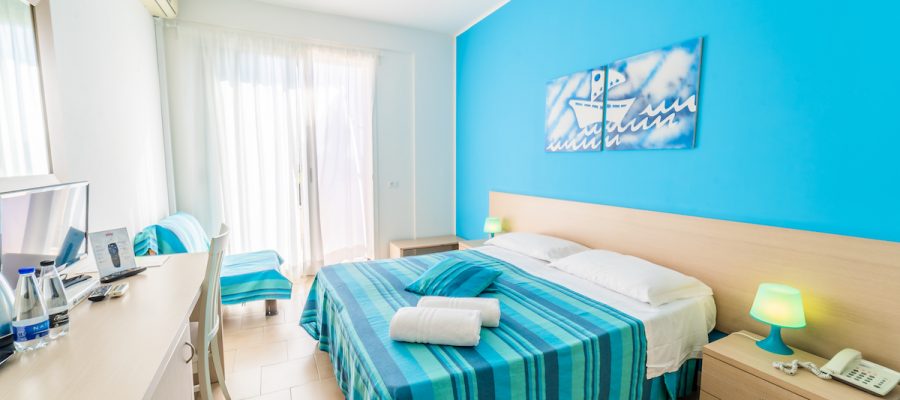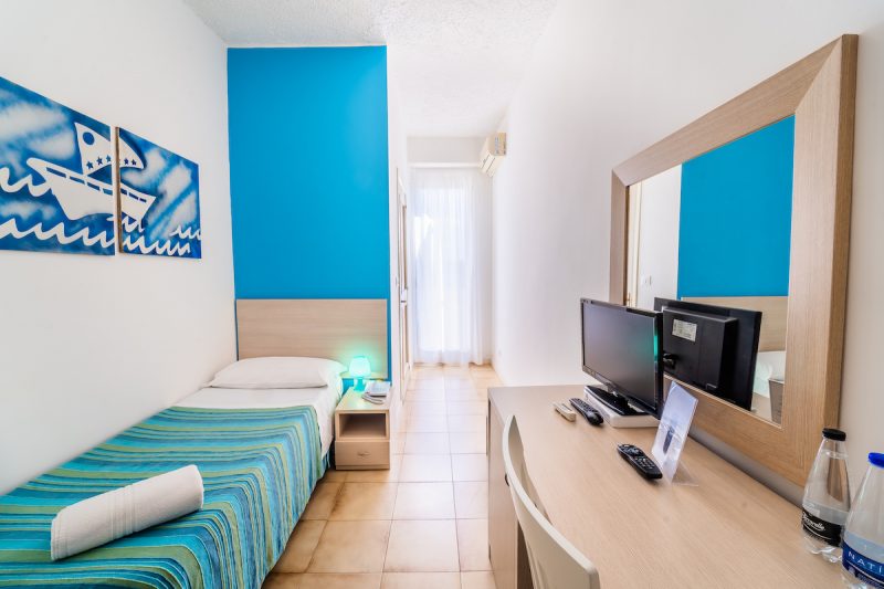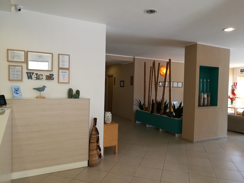 Descrizione e servizi : Le 45 camere si distinguono in singole, doppie/matrimoniali, quadruple. Le triple e quadruple possono avere letti aggiunti o poltrone letto, o anche 3 o 4 letti separati. Tutte sono dotate di bagno privato con box doccia, phon e set di cortesia, telefono, TV, frigobar, aria condizionata e se richiesto servizio sveglia. Le camere al piano terra hanno una verandina, al primo piano un balcone o finestra. La struttura è fornita di ascensore. Immerse nel verde degli alberi di alto fusto e delle siepi di sempreverde si trovano 32 Garden Room con verandina attrezzata con sedie e circondata dal verde delle siepi. La piscina aperta dal 30/05 al 27/09, wi-fi in struttura e zone esterne, area relax esterna in giardino ben curato. Sala giochi all’aperto, lavanderia a gettoni. Inoltre l’animazione dal 06 Giugno all’11 Settembre, escluso il sabato, allieta con un programma per adulti e bambini con giochi ed attività e tornei sportivi anche in spiaggia, mini club 5/12 anni per i più piccoli, mini club serali, baby dance, nolo bici. Beach volley, bocce, ping pong, aerobica, acqua gym, risveglio muscolare, show serali. Parcheggio interno a pagamento € 10 al giorno, teli mare € 5 al giorno.